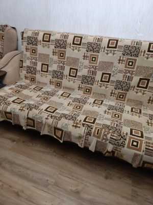 Диван -кровать бежевого цвета с велюровой обивкой. Был в употреблении один год. Куплен был за 40 т рублей.